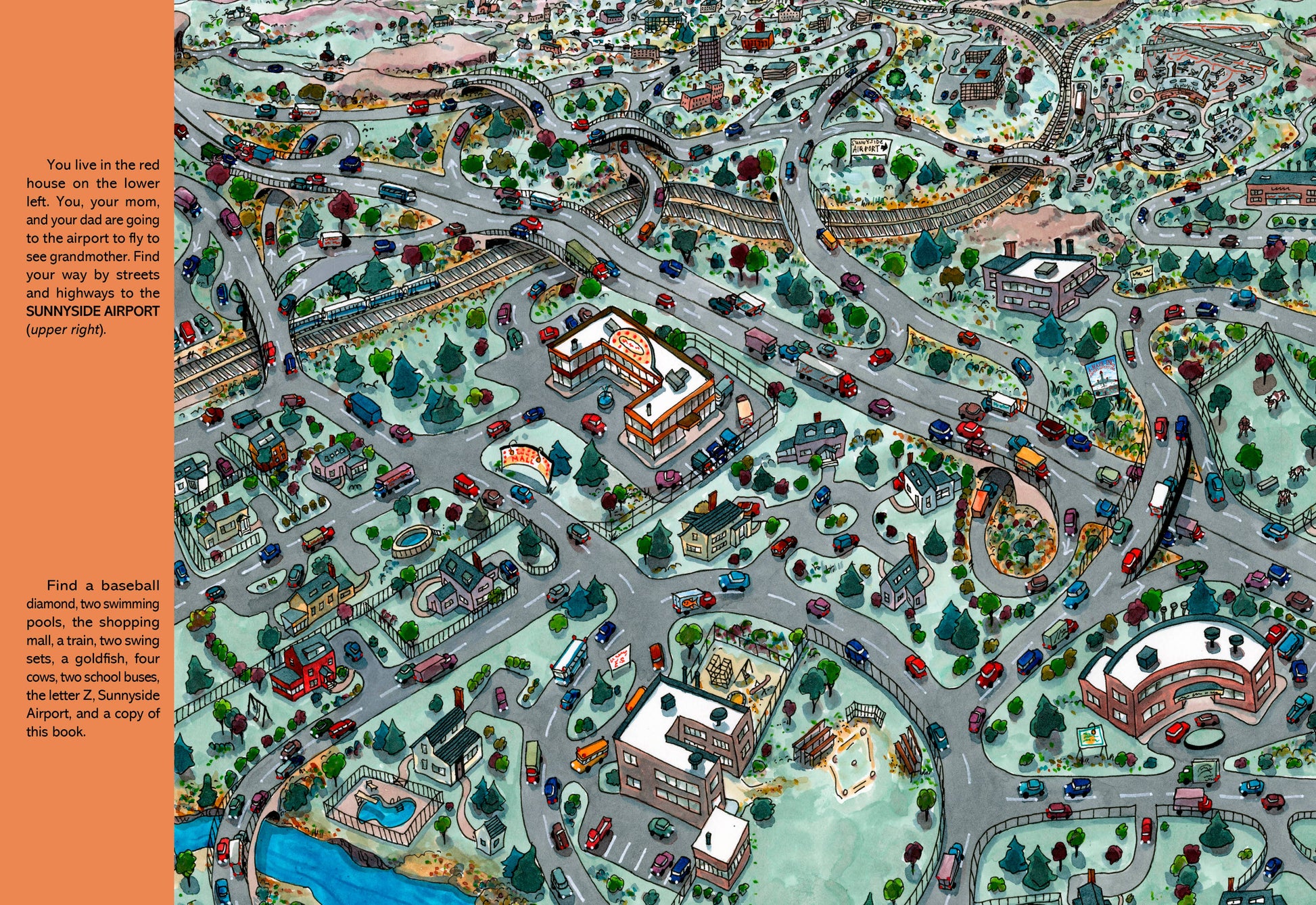 An interactive children's activity book with an airport theme, featuring 10 interconnected mazes and seek-n-find games designed to enhance critical-thinking and spatial skills.