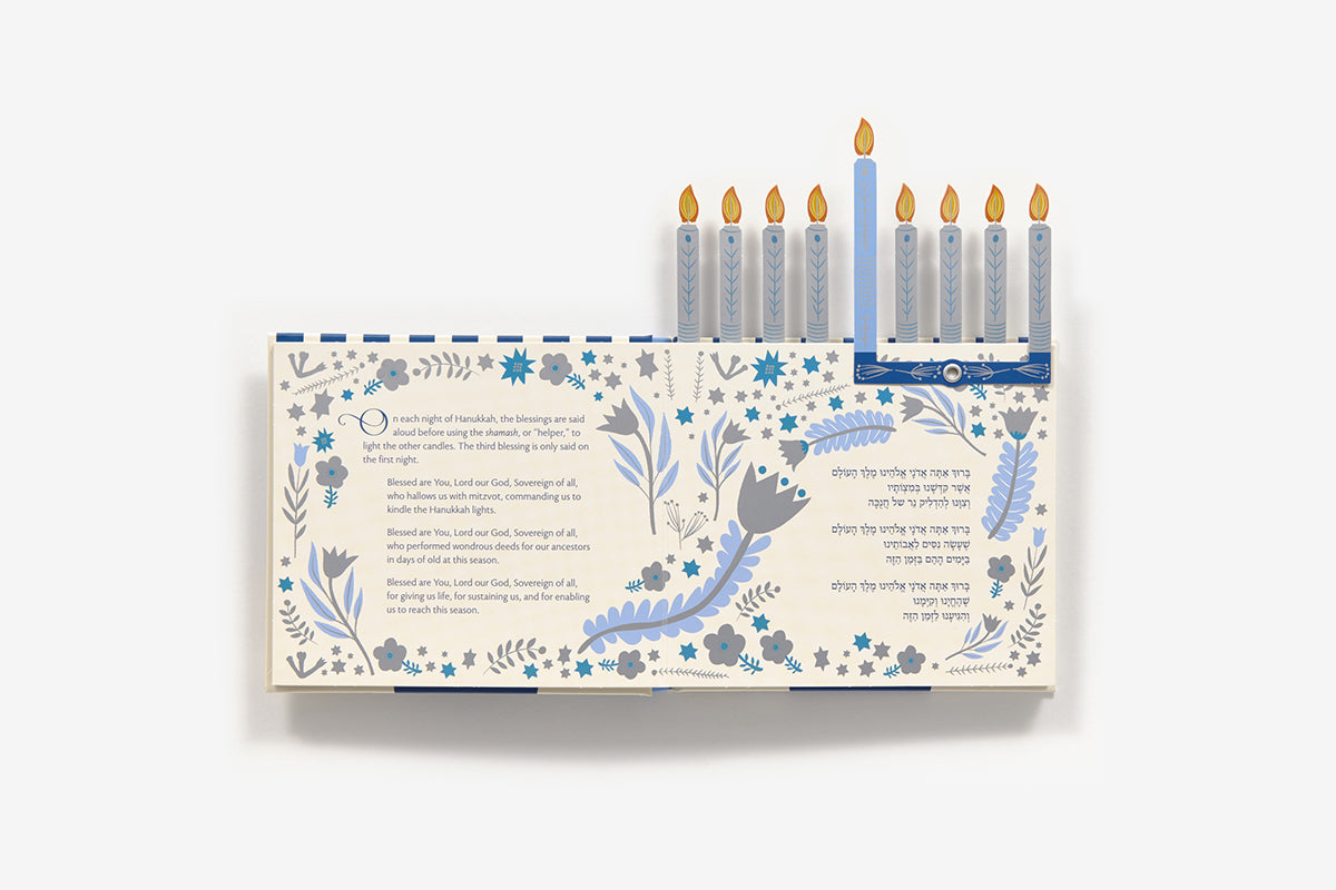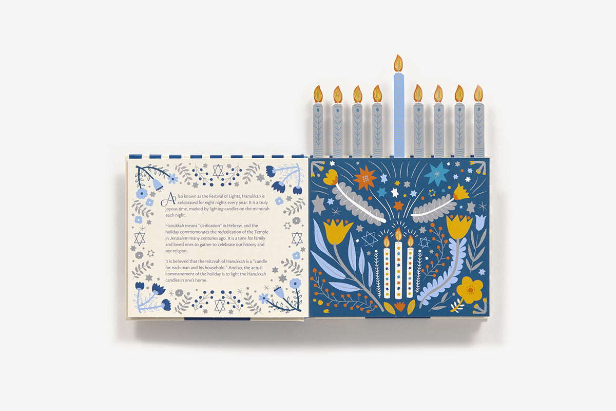 Celebrate the eight days of Hanukkah with a unique book that transforms into a menorah to display on a desk, table, or windowsill. The pages feature traditional prayers in Hebrew and English, and a retelling of the history of Hanukkah, along with pop-up candles that you can turn up each night of the holiday. Simply take the jacket off, pop up the candles, and turn Hanukkah in a Book into a fully “lit” menorah—no matches required!