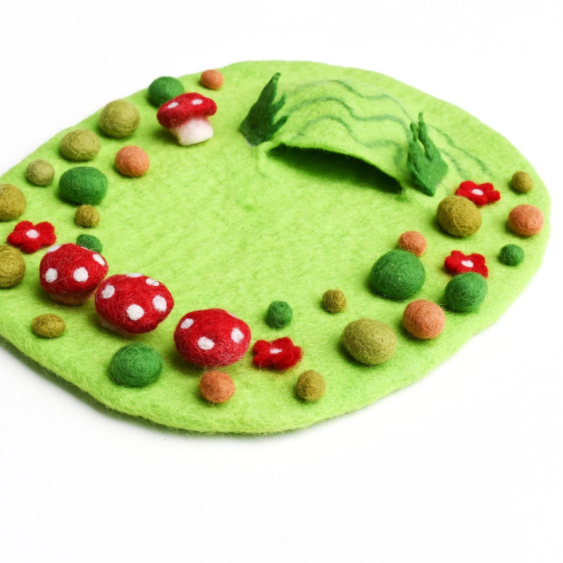 Folklore says fairies appear when there is a ring of toadstools. Our Fairy Toadstool Garden is made from wool felt and it features little toadstools, colorful rocks and a tiny cave for the critters to hide in.
