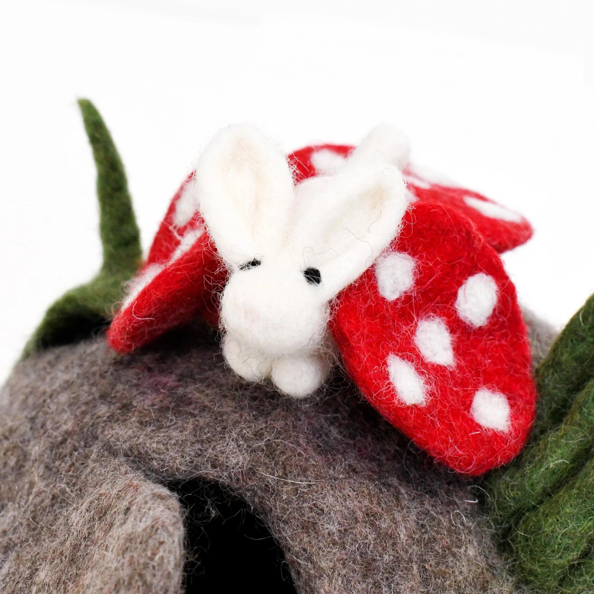 Create a creative and magical playtime with our felt toadstool house, where a little white rabbit lives. This is a sensory toy for young children as they open and shut the door to reveal a needle-felted rabbit inside. They can also hide or contain their favourite toys in it.