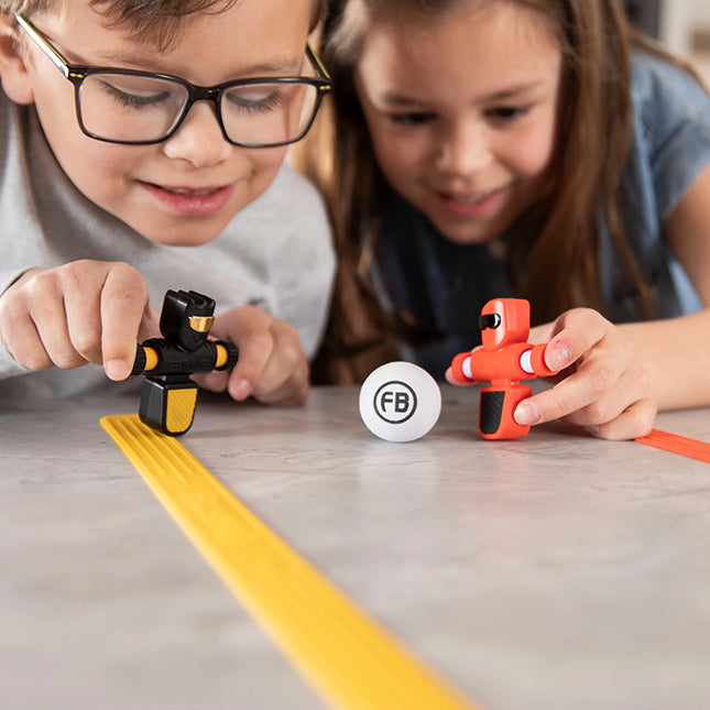 Roll out one of the silicone goal lines onto your side of the table, then grab your Foosbot. When you squeeze its arms, it spins to kick the ball FAST. Can you get the ball past your opponent's goal while letting nothing past yours? With intense, fast-paced gameplay, portable design, and more Foosbots to collect, the thrill never stops!