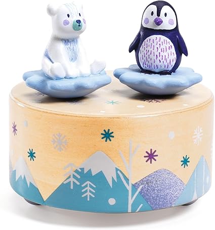 Delight your little one with the Ice Park Melody Music Box! Wind it up to watch the charming polar bear and penguin skate and spin to Mozart’s “Toy Symphony.” This beautifully decorated music box soothes and entertains while encouraging motor skills, visual focus, and a love for music. Crafted from high-quality, non-toxic materials, it meets all European and American safety standards. Perfect for toddlers 12 months and up, it includes one wooden music box and two playful figurines for endless fun.