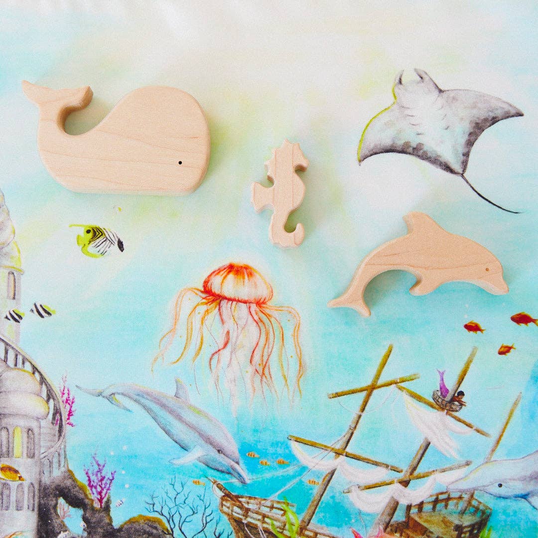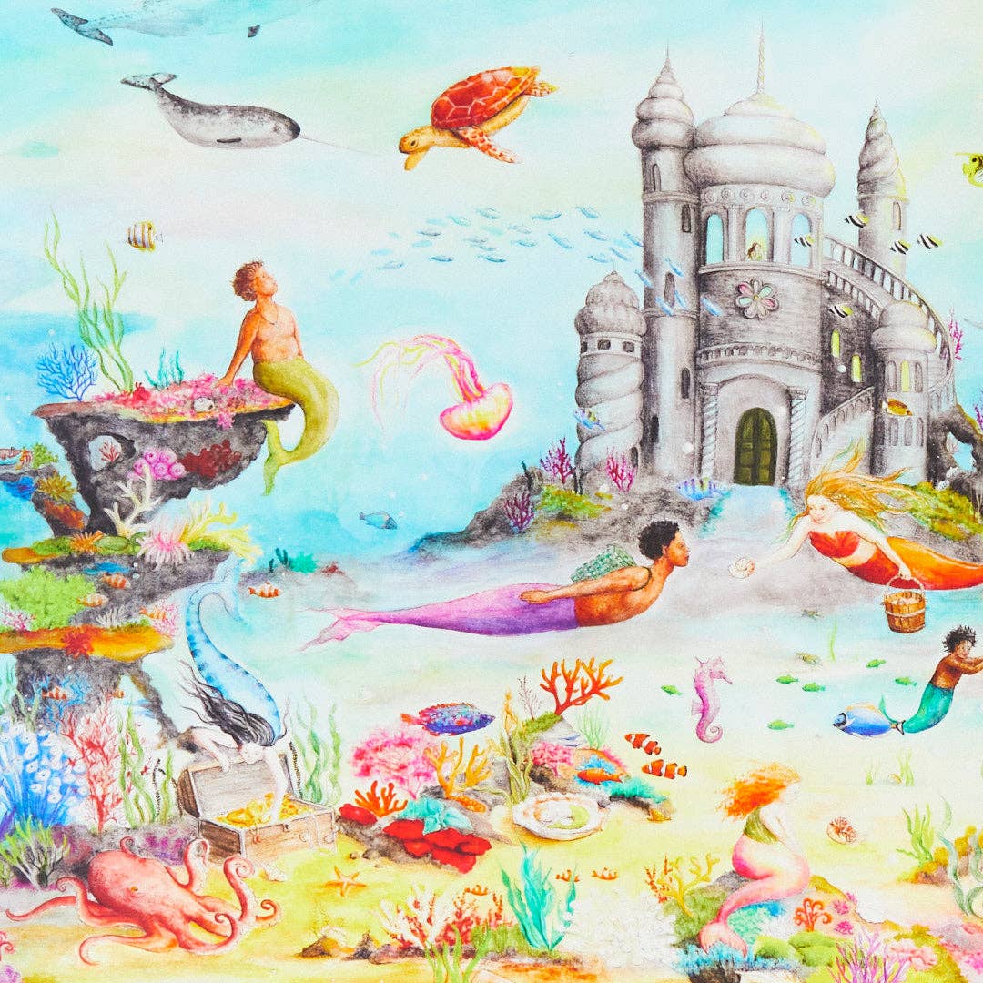 Seek and find mermaids, mermen, marine creatures and more! Perfect for quiet time for children by themselves and a wonderful toy to bring on trips. Packs small and light, and will be enjoyed for many hours as there is always something to new to find! Seek & Find Playsilks are 21" x 26", made from heavyweight, 100% pure mulberry silk. Included with every Seek & Find Playsilk are one of a kind cards with suggestions for children to easily begin the seek and find fun! Seek & Find Playsilks are made in collaboration with different artists. The Mermaid Seek & Find Playsilk features original artwork by Mhairi Hellbrandt.