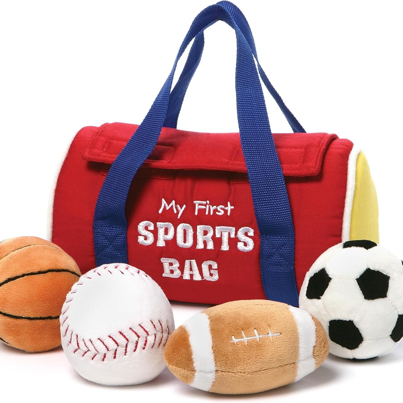 Introduce your little one to the world of sports with the My First Sports Bag Playset from Baby GUND! Featuring a plush duffel bag and four soft sensory toys, this set is perfect for stimulating and entertaining babies. Easy to clean and safe for all ages, it makes for a great gift for new parents and baby showers. Give the gift of a lifetime of hugs with GUND.