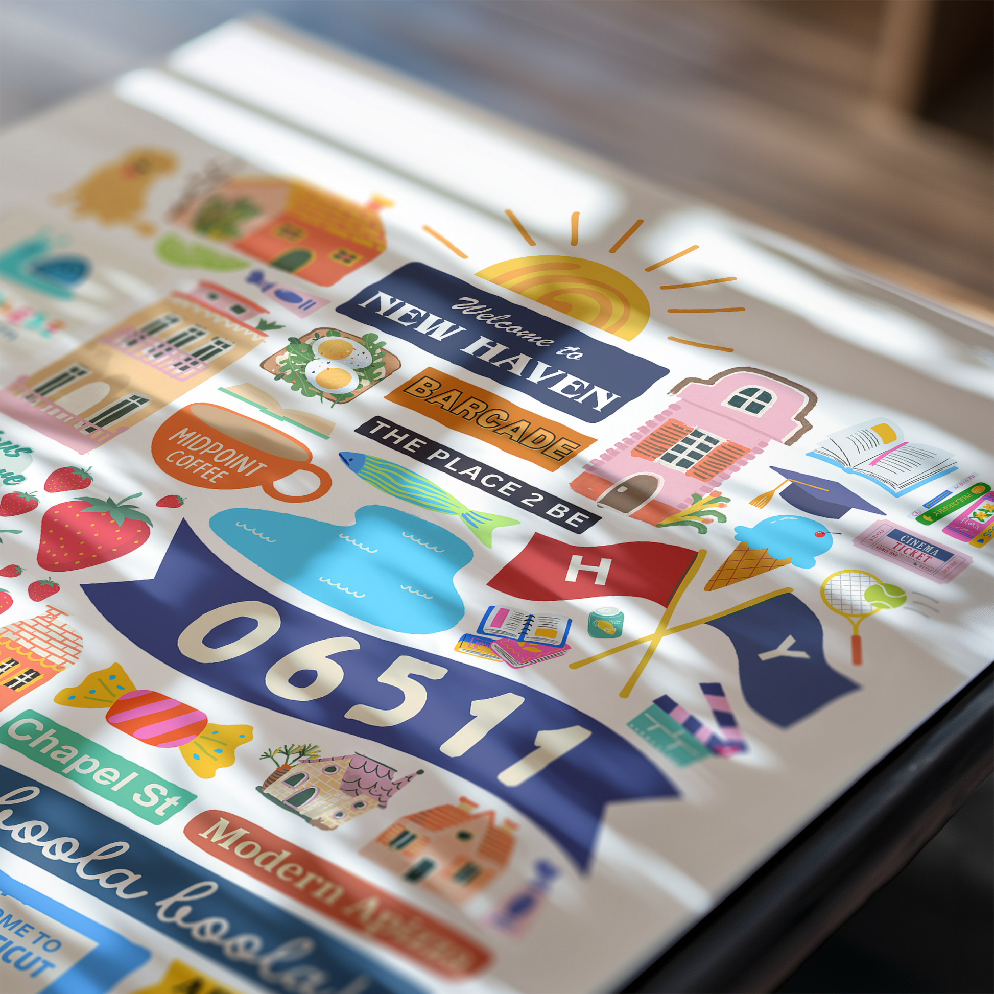 Colorful, custom-designed print featuring local attractions. All prints are printed on glossy photo paper. All framed prints come in a lightweight, white frame.