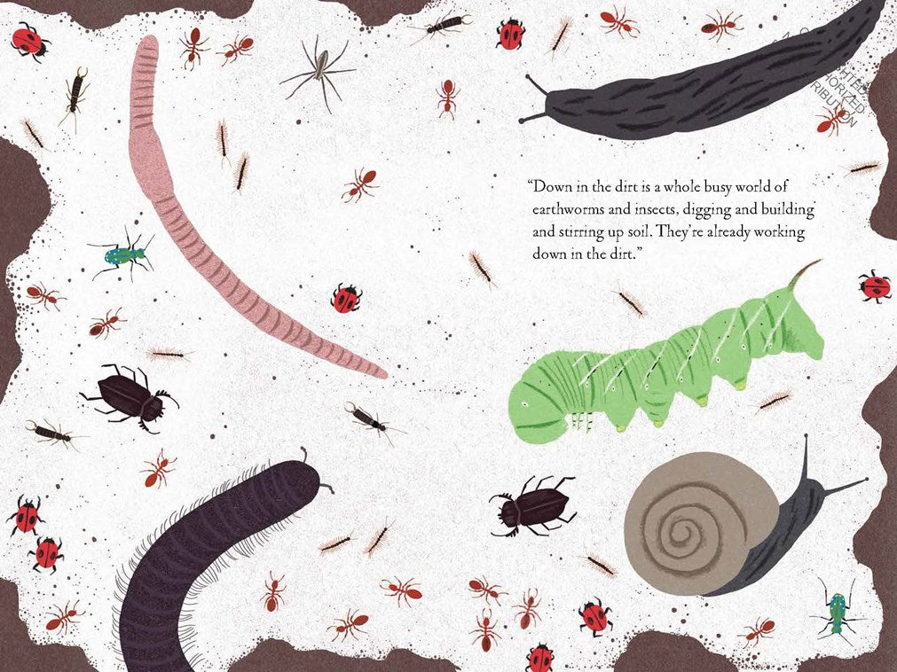 Up in the garden, the world is full of green—leaves and sprouts, growing vegetables, ripening fruit. But down in the dirt exists a busy world—earthworms dig, snakes hunt, skunks burrow—populated by all the creatures that make a garden their home.