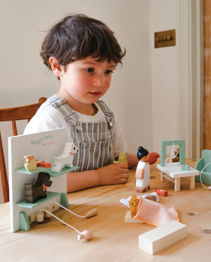 Step into the Waggy Tails Dog Salon, where your little groomer can pamper seven adorable dog breeds including a Giant Poodle, Husky, Beagle, and more! This playset features a washing area with shower head, grooming table with brush, and a back wall complete with hairdryer and clippers. Accessories like towels, dog products, bones, a trophy, and podiums add to the fun. Perfectly sized for dollhouses.